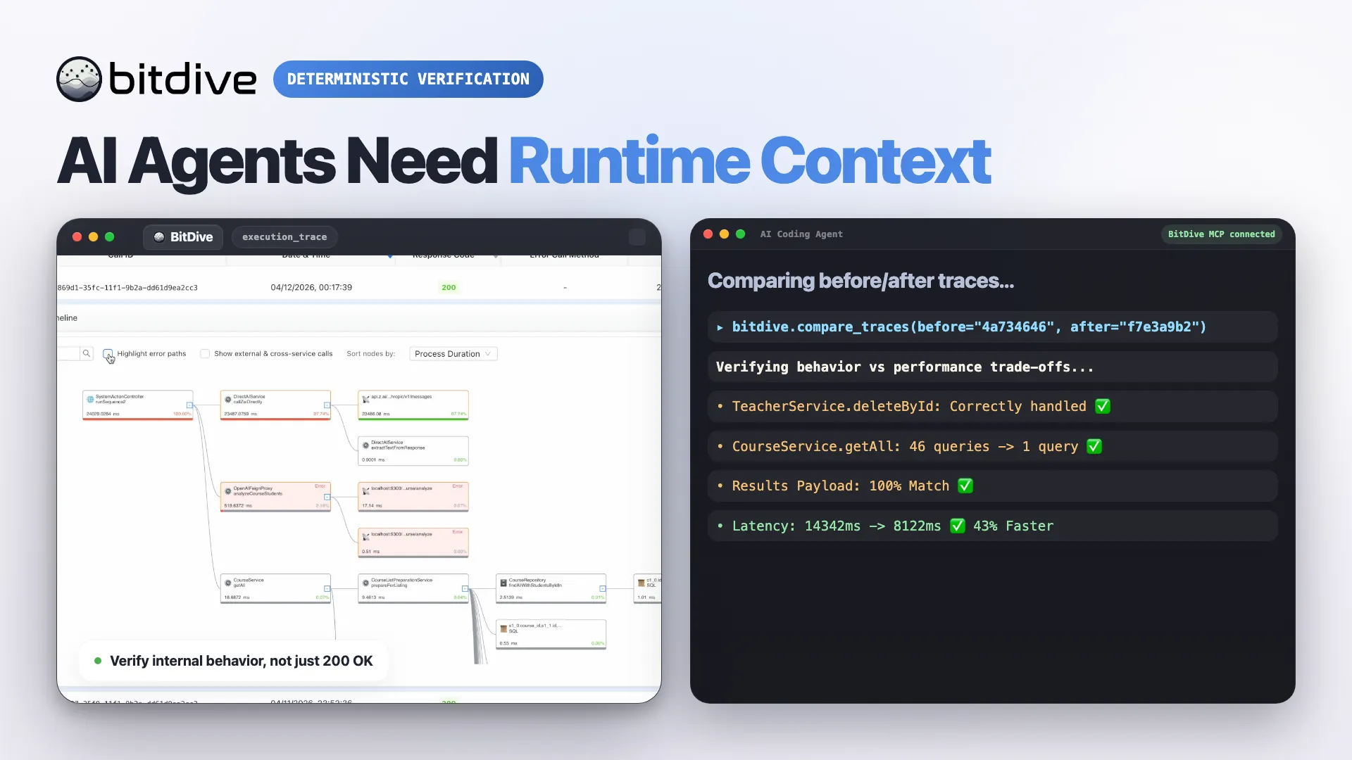 Instead of reconstructing state from logs, BitDive captures the real execution surface that matters to verification.
